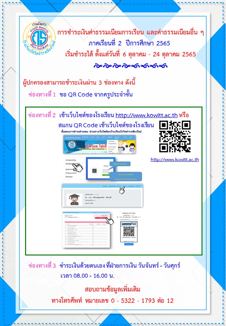 รายละเอียดข่าว : ประกาศโรงเรียนโกวิทธำรงเชียงใหม่ เรื่อง กำหนดการปิดภาคเรียนที่ ๑ ปีการศึกษา ๒๕๖๕ และเปิดภาคเรียนที่ ๒ ปีการศึกษา ๒๕๖๕