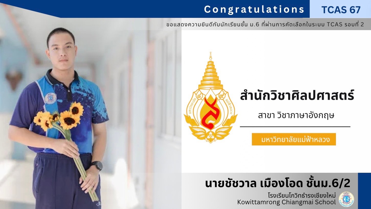 รายละเอียดข่าว : ขอแสดงความยินดีกับนักเรียนระดับชั้นมัธยมศึกษาปีที่ 6 ปีการศึกษา 2566 ที่ได้รับคัดเลือกเรียนต่อระดับอุดมศึกษา TCAS 67 (รอบที่2)