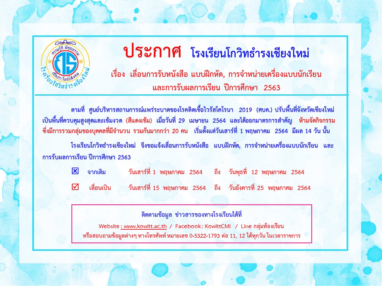 ข่าวประกาศ : ประชาสัมพันธ์ เลื่อนการรับหนังสือ แบบฝึกหัด และการจำหน่ายเครื่องแบบนักเรียน
