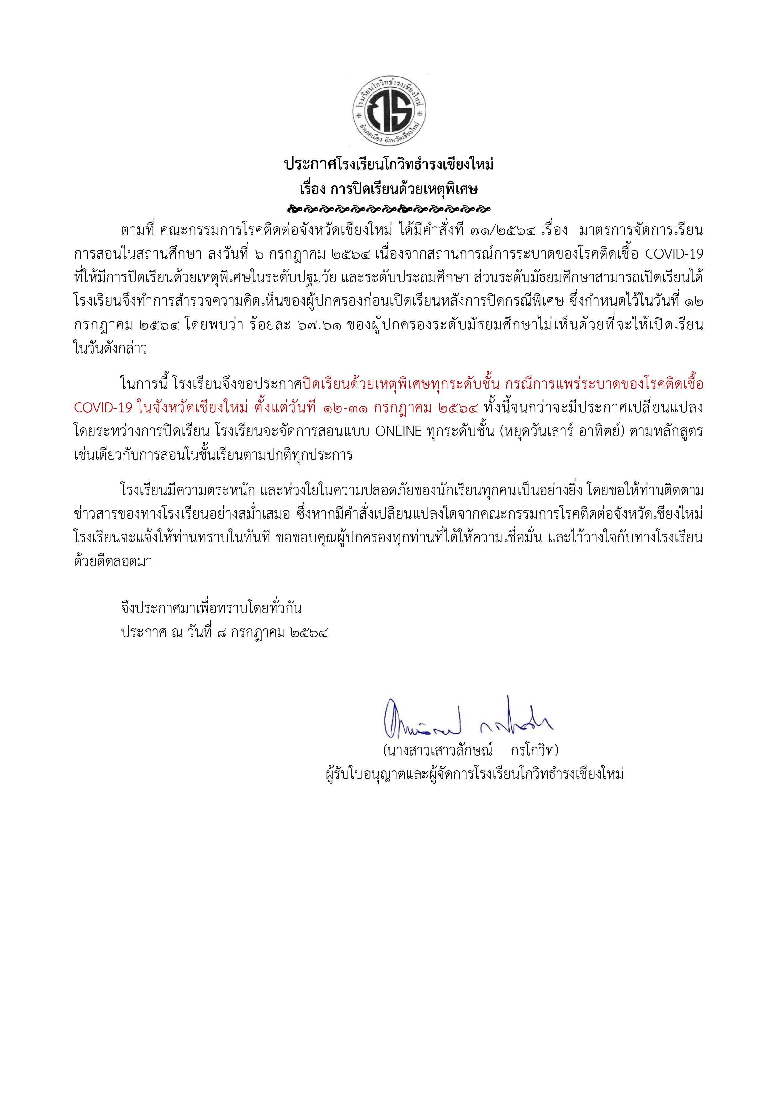 ข่าวประกาศ : ประกาศโรงเรียนโกวิทธำรงเชียงใหม่ เรื่อง กำหนดการปิดภาคเรียนที่ ๑ ปีการศึกษา ๒๕๖๕ และเปิดภาคเรียนที่ ๒ ปีการศึกษา ๒๕๖๕